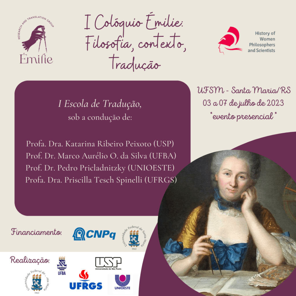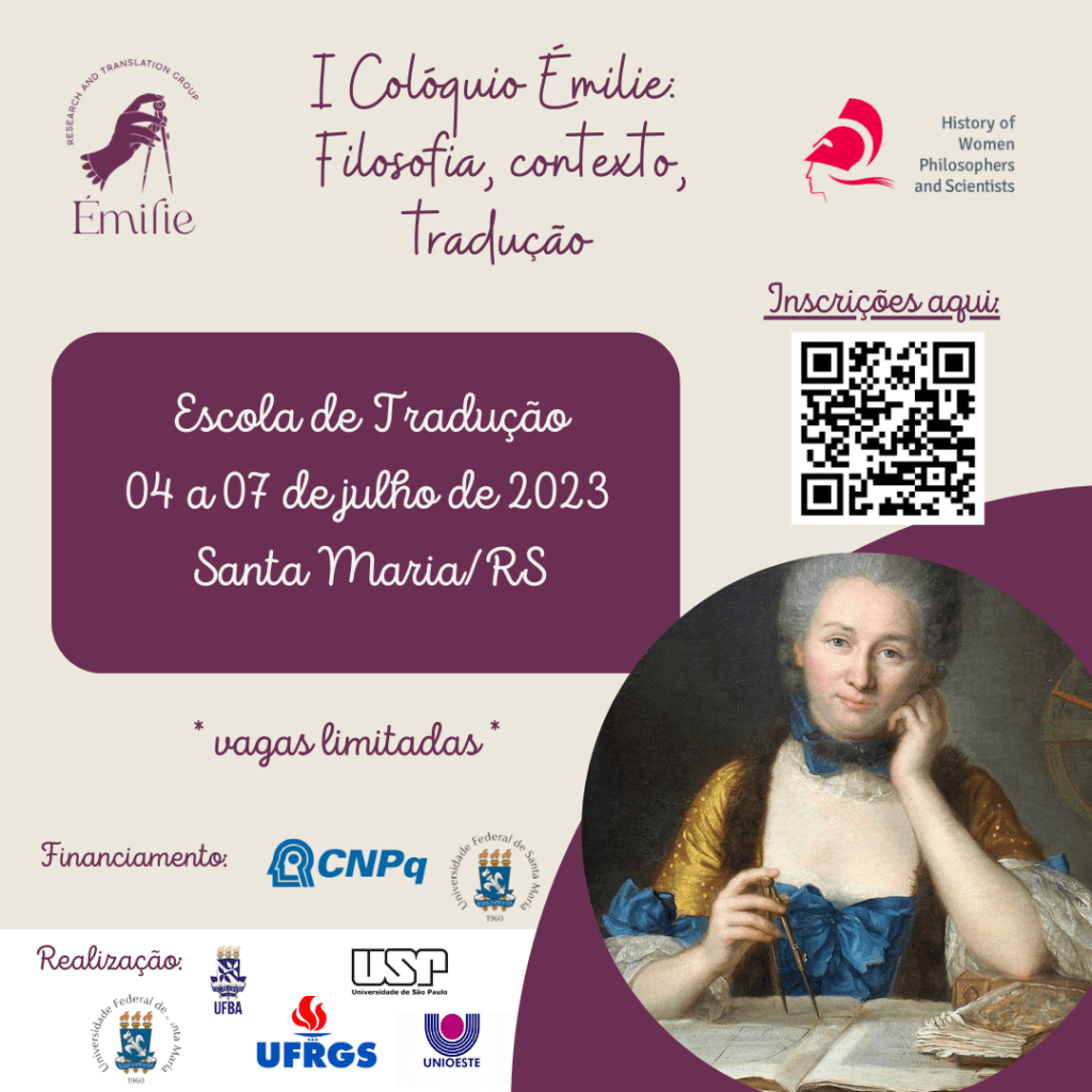 O Grupo Émilie abriu as inscrições para a sua I Escola de Tradução, que ocorrerá nas manhãs de 04 a 07 de julho na Universidade Federal de Santa Maria (UFSM). Este evento acontece dentro do I Colóquio Émilie: Filosofia, contexto, tradução. Seu objetivo é proporcionar aos seus participantes alguns momentos da experiência de traduzir um texto inédito em português. Os participantes devem escolher uma dentre as três seguintes sessões: