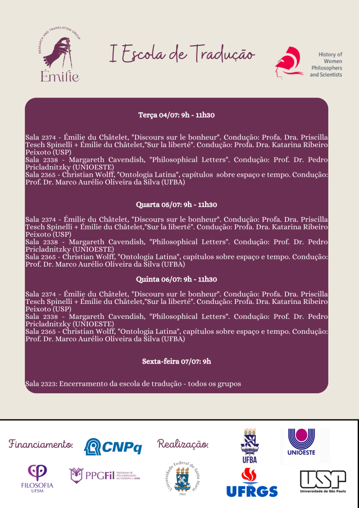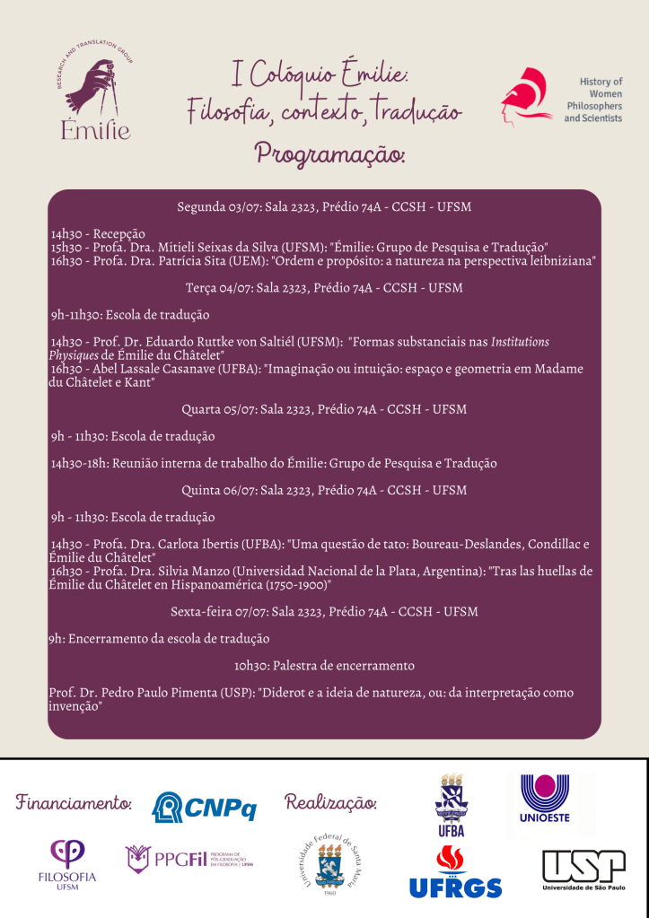 Entre os dias 03 e 07 de julho, na Universidade Federal de Santa Maria (UFSM), ocorrerá o I Colóquio Émilie: Filosofia, contexto, tradução. A programação do evento está no card abaixo.