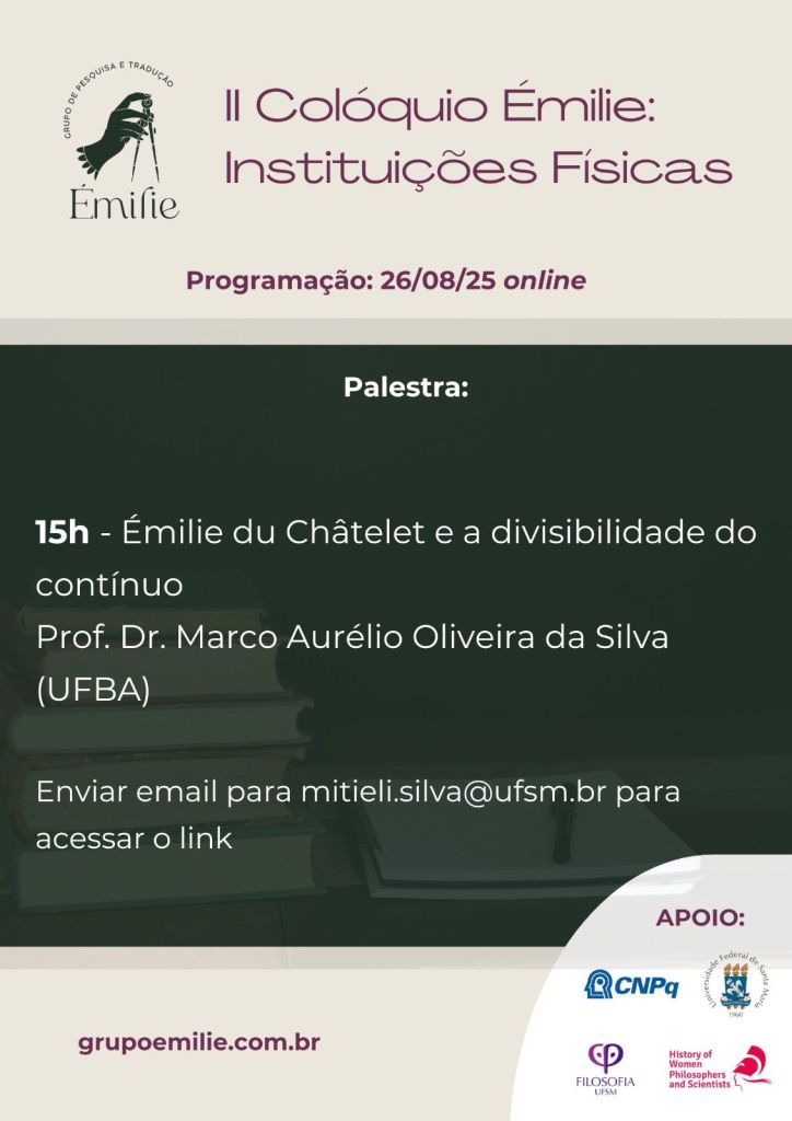 O Grupo Émilie convida para a palestra “Émilie Du Châtelet e a divisibilidade do contínuo”, que será ministrada pelo professor Marco Aurélio Oliveira da Silva (UFBA) no dia 26/08/25 (terça-feira) às 15 horas. A palestra ocorrerá virtualmente, pela plataforma Google Meet.