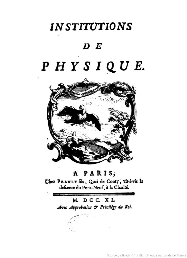 Está em andamento a tradução da primeira edição da obra Institutions de Physique, de 1740, inédita em português. A publicação da tradução está prevista para 2024.
